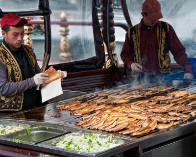 Здесь прямо на ваших глазах готовят свежую рыбу. Её жарят на мангале и запекают в пергаменте. Вы попробуете кокореч, ислак бургер, ичли кефте, кебабы, шаурму, приготовленные с большой любовью и вниманием к деталям. А для сладкоежек и детей есть турецкие сладости и мороженое!