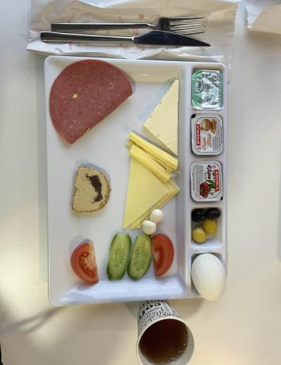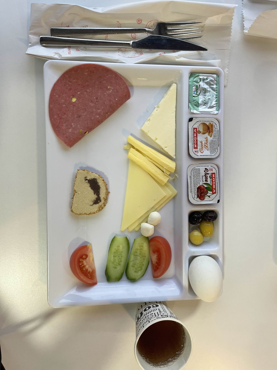Завтрак на корабле. Вас ждёт простой, но очень вкусный завтрак: яйца, свежие овощи, сыр, маслины, пончики и лепёшка с начинкой.