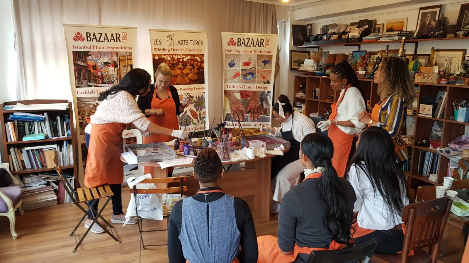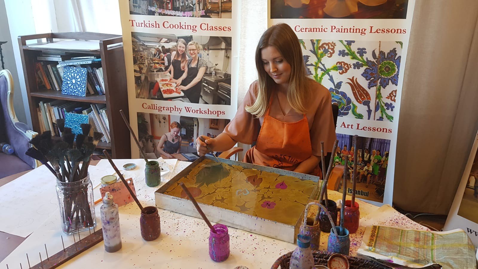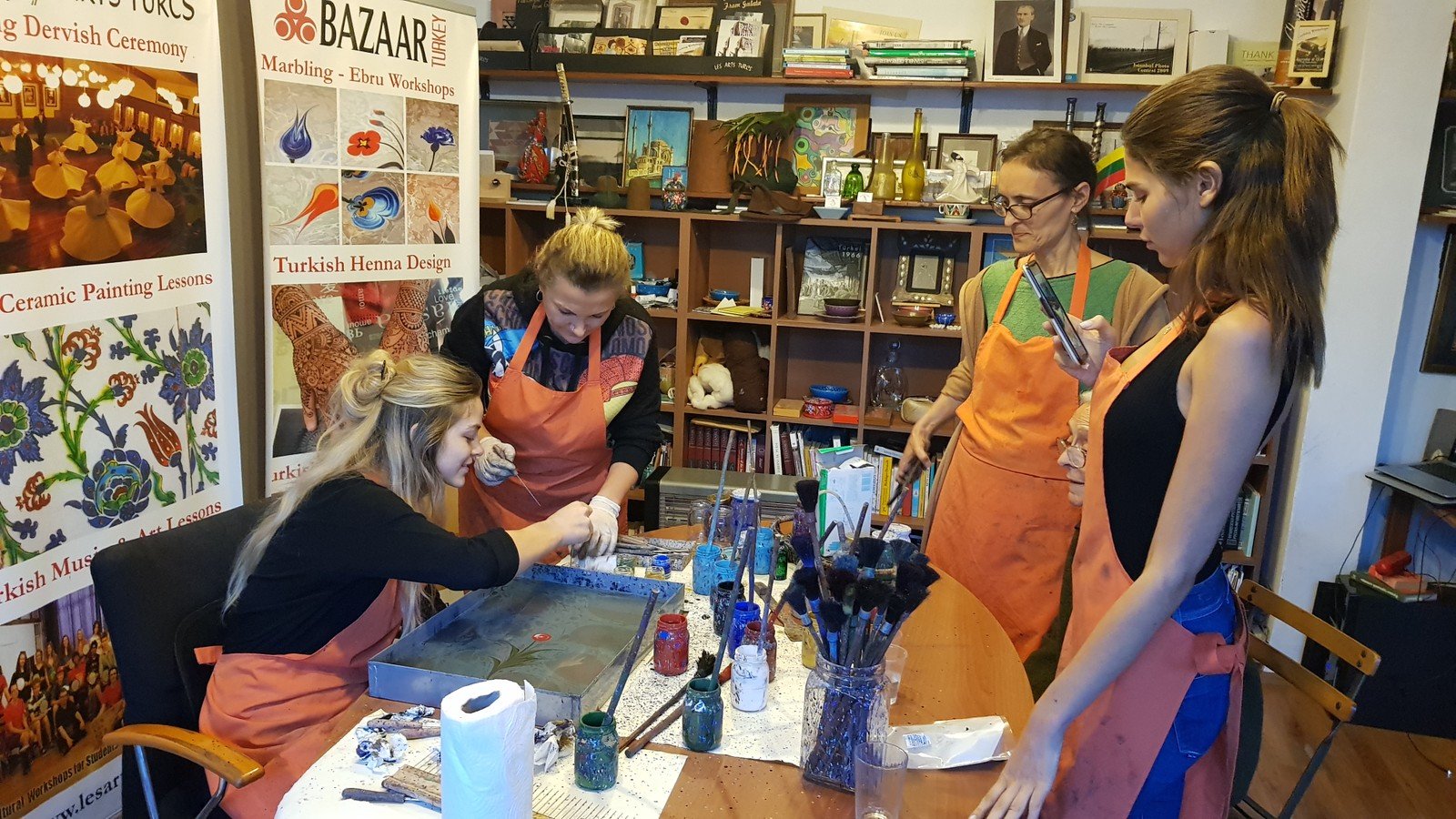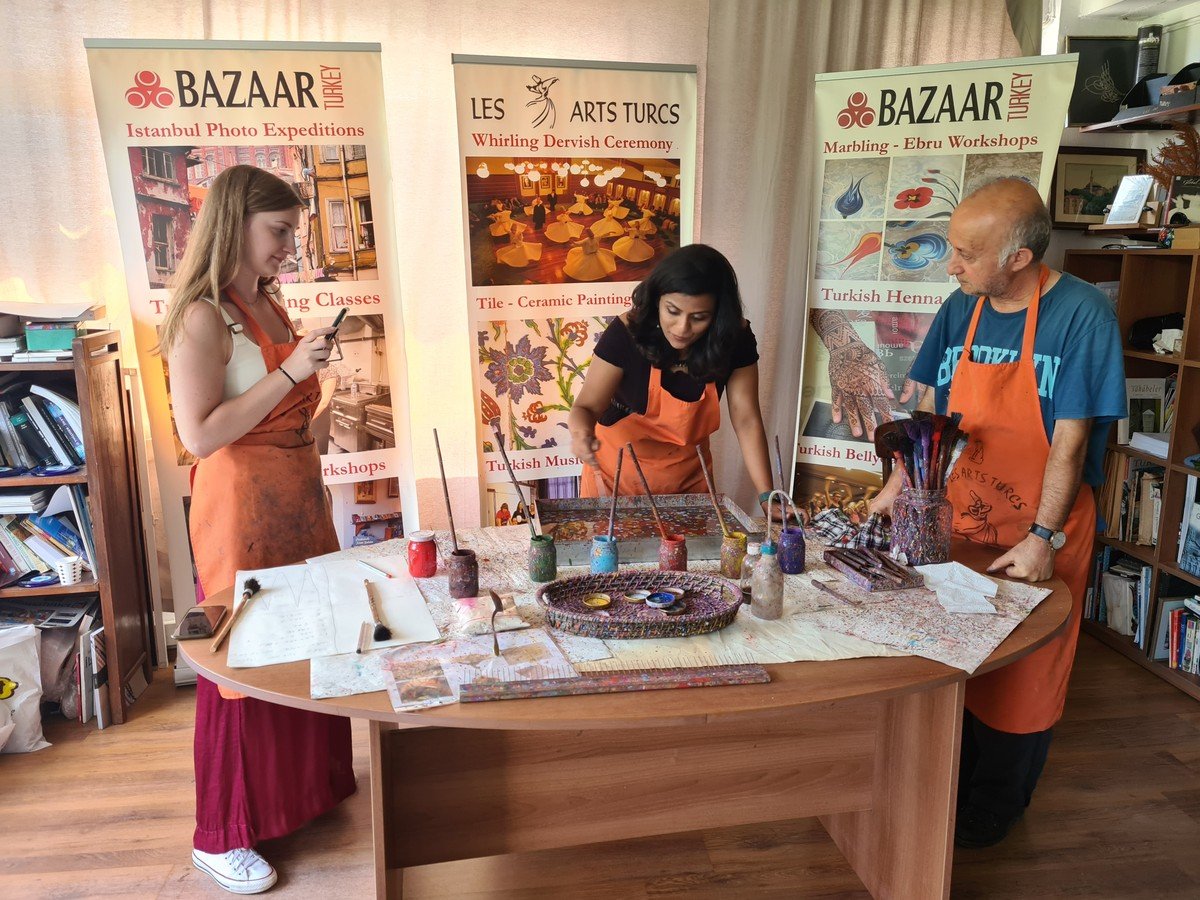 Погружение в колорит последующих часов начнётся уже на подходе к художественной галерее. Мы находимся в Султанахмете — это старая часть Стамбула в окружении мечетей, вод Мраморного моря, Босфора, Золотого Рога и аутентичных улочек. На мастер-классе вас угостят кофе по-турецки и расскажут подробнее об эбру и материалах, после чего можно приступать к творчеству (под бережным присмотром мастера). Если вас настолько увлечёт процесс, что захочется продолжения, наши преподаватели с радостью поддержат занятия дистанционно (в Zoom). Для гостей это не только знакомство с новым видом искусства, но и медитация, плод которой — картина с завораживающими узорами.