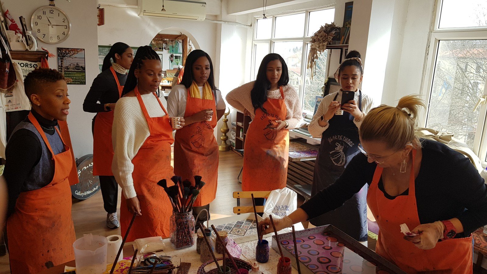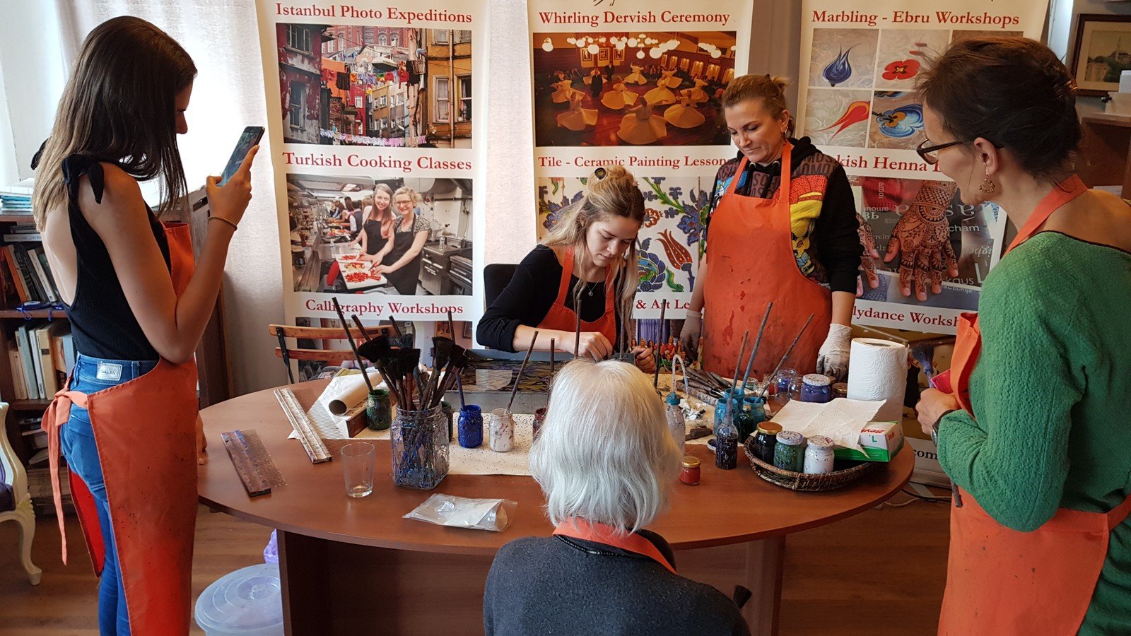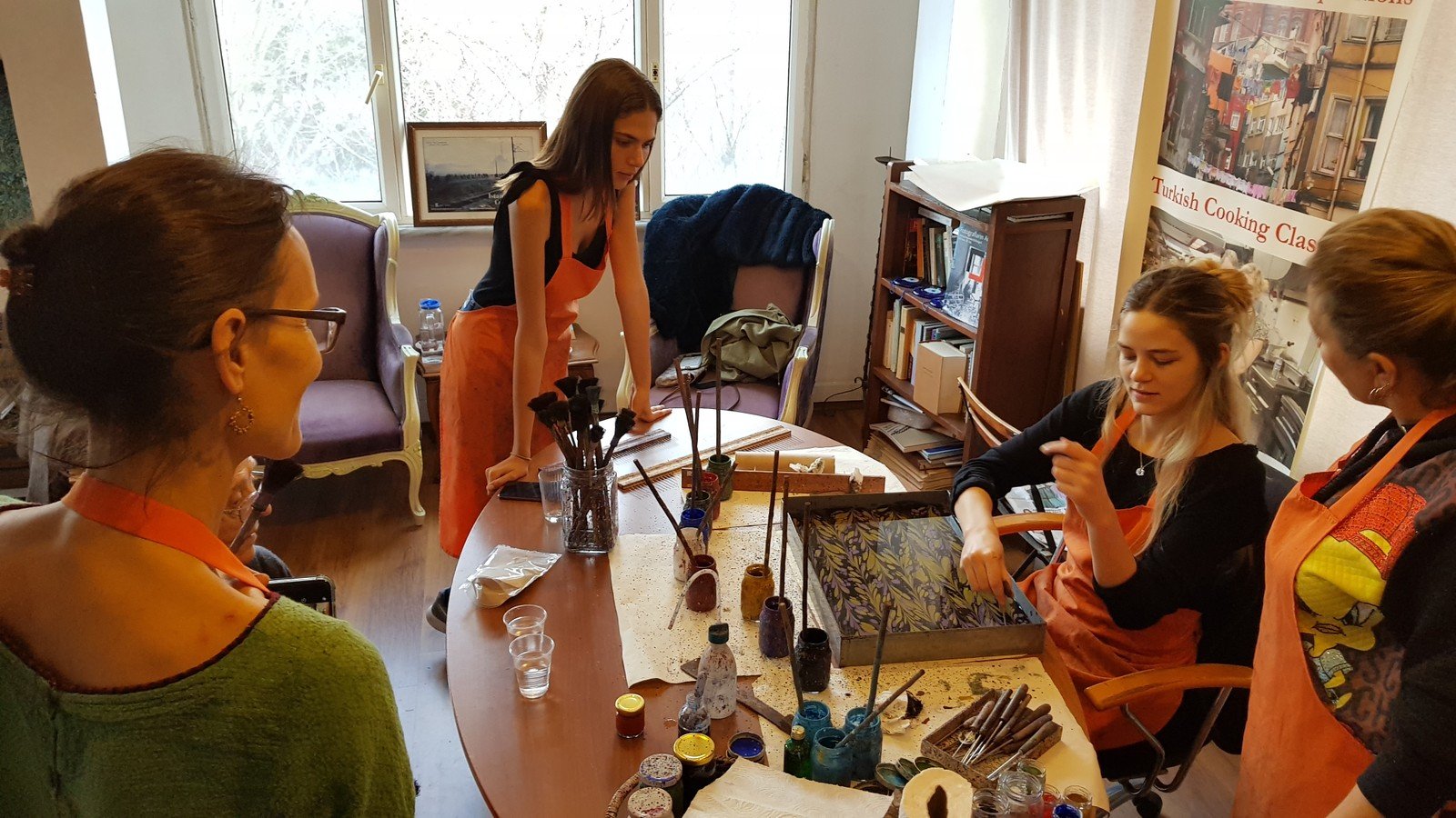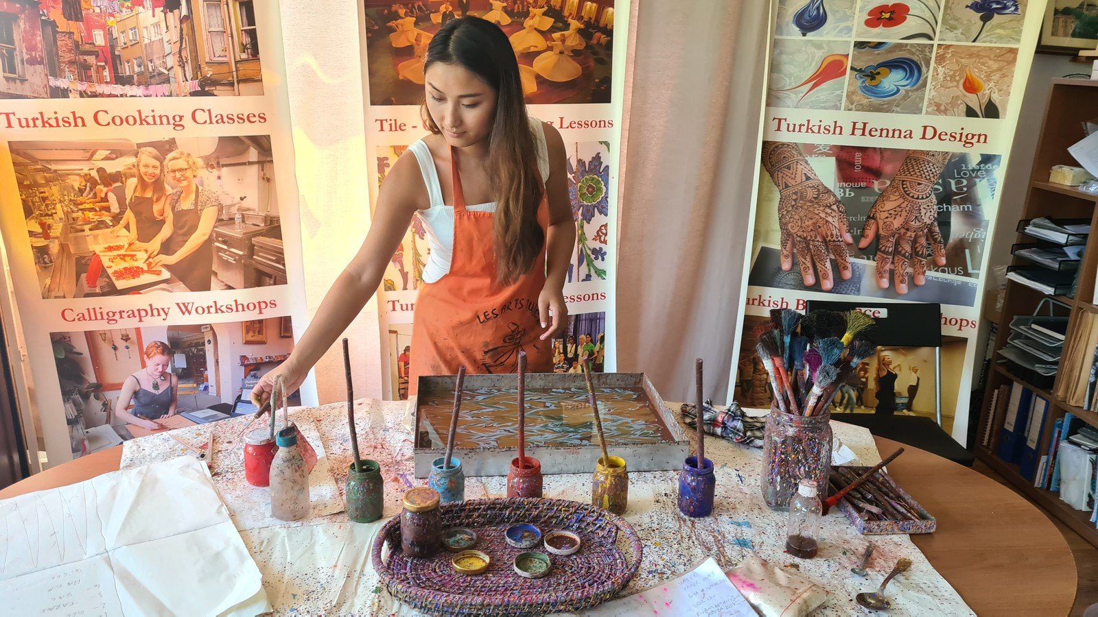 Погружение в колорит последующих часов начнётся уже на подходе к художественной галерее. Мы находимся в Султанахмете — это старая часть Стамбула в окружении мечетей, вод Мраморного моря, Босфора, Золотого Рога и аутентичных улочек. На мастер-классе вас угостят кофе по-турецки и расскажут подробнее об эбру и материалах, после чего можно приступать к творчеству (под бережным присмотром мастера). Если вас настолько увлечёт процесс, что захочется продолжения, наши преподаватели с радостью поддержат занятия дистанционно (в Zoom). Для гостей это не только знакомство с новым видом искусства, но и медитация, плод которой — картина с завораживающими узорами.