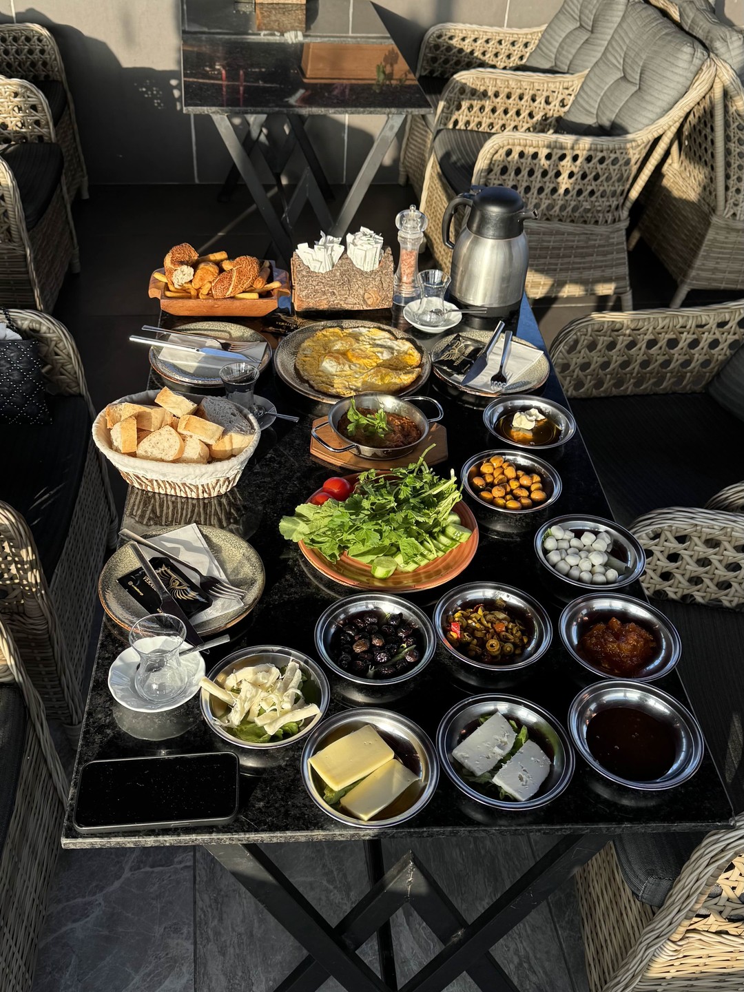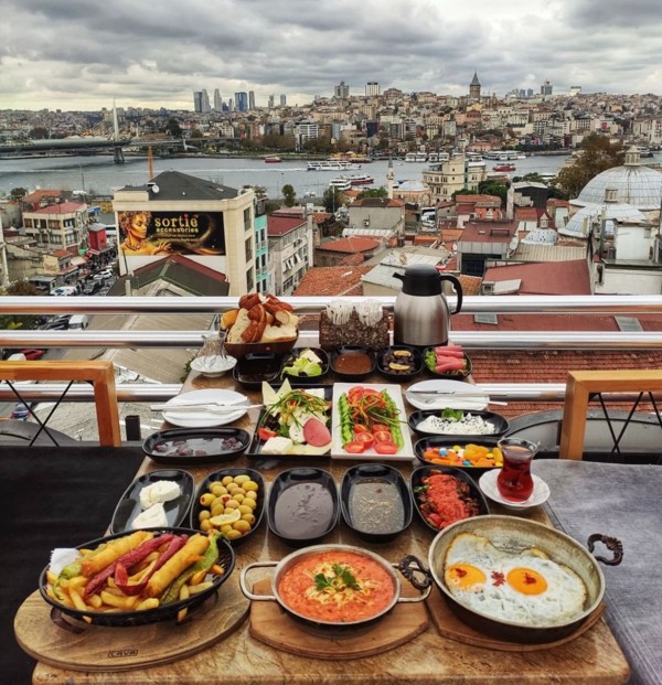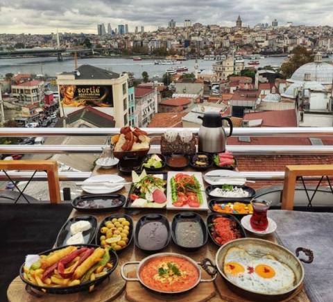 На традиционном стамбульском завтраке вы сможете попробовать менемен (яичницу с овощами), сосиски, сыры, оливки, сырные завитушки, пекмез (варенье без сахара), мёд с каймаком (по консистенции — что-то среднее между сметаной и маслом), симит (турецкий бублик), огурцы и помидоры, виноград.